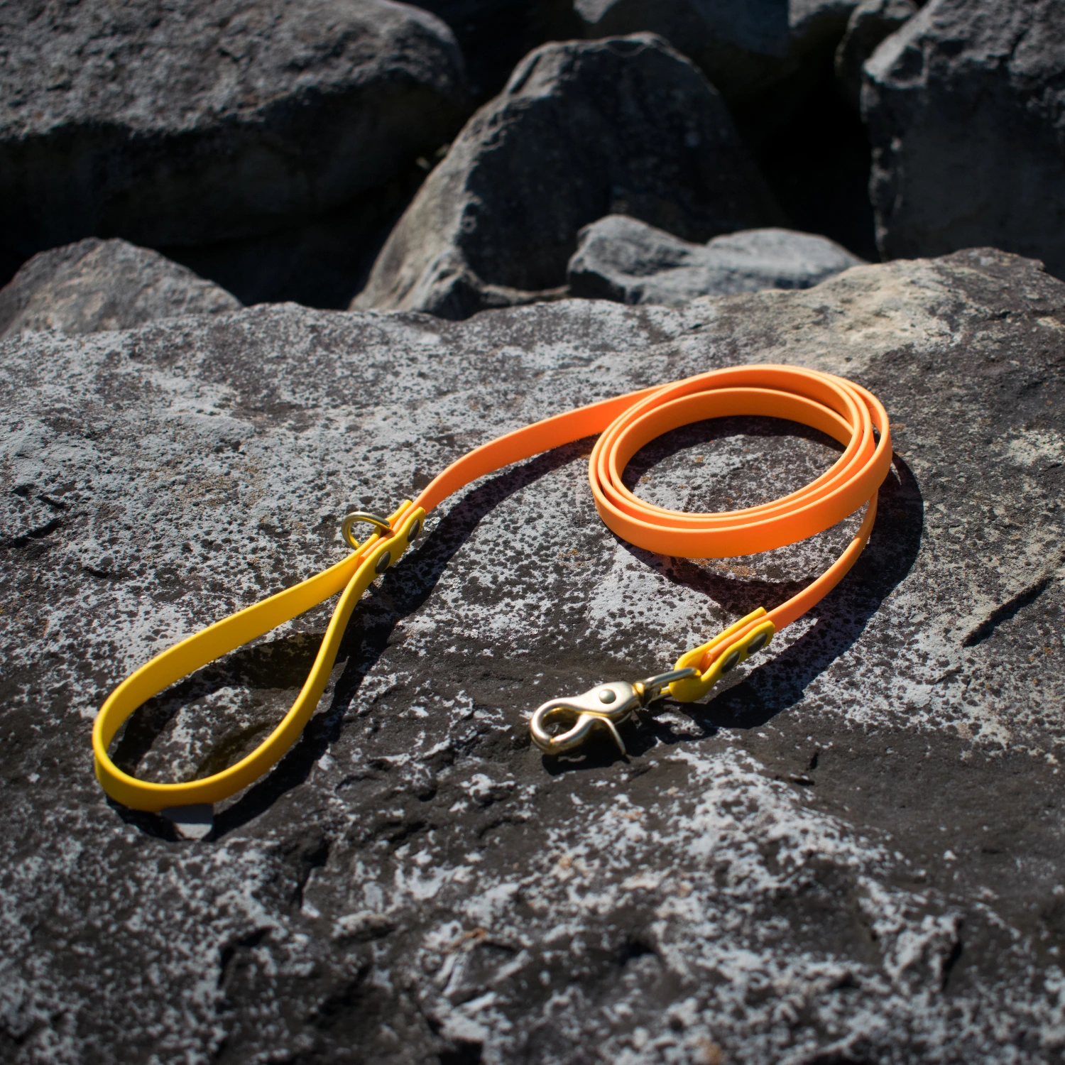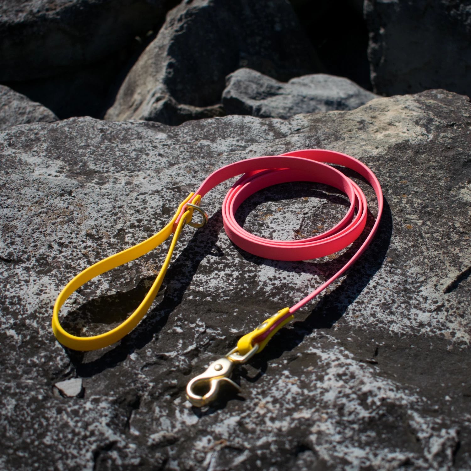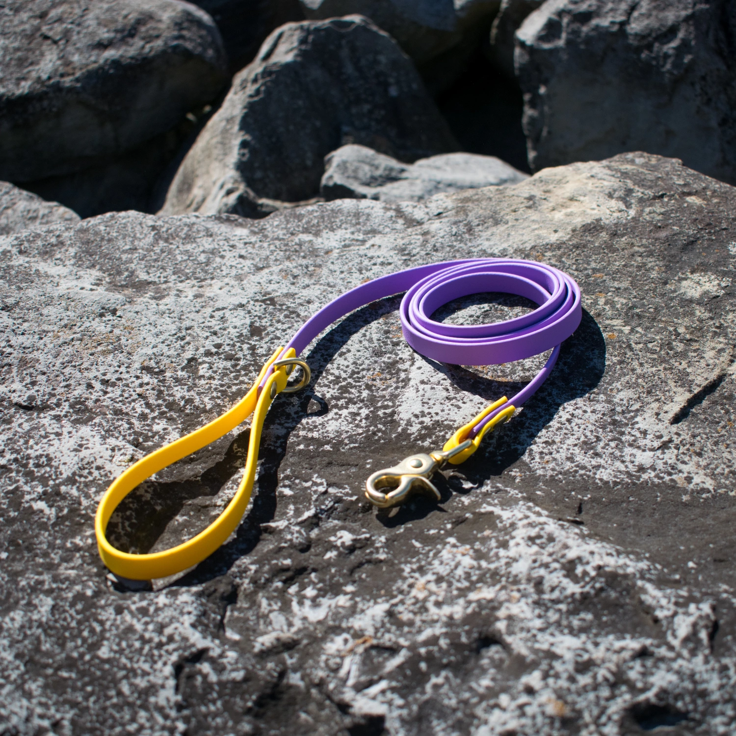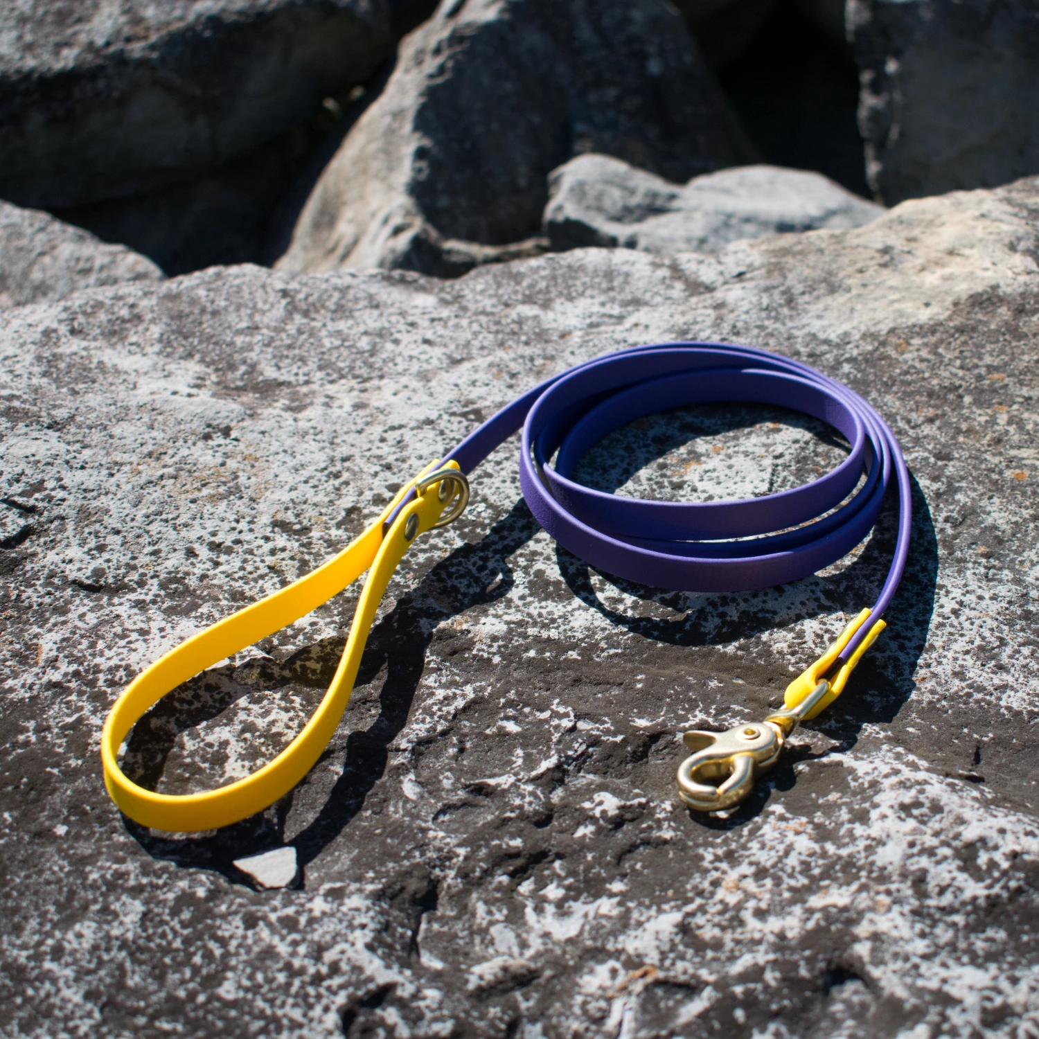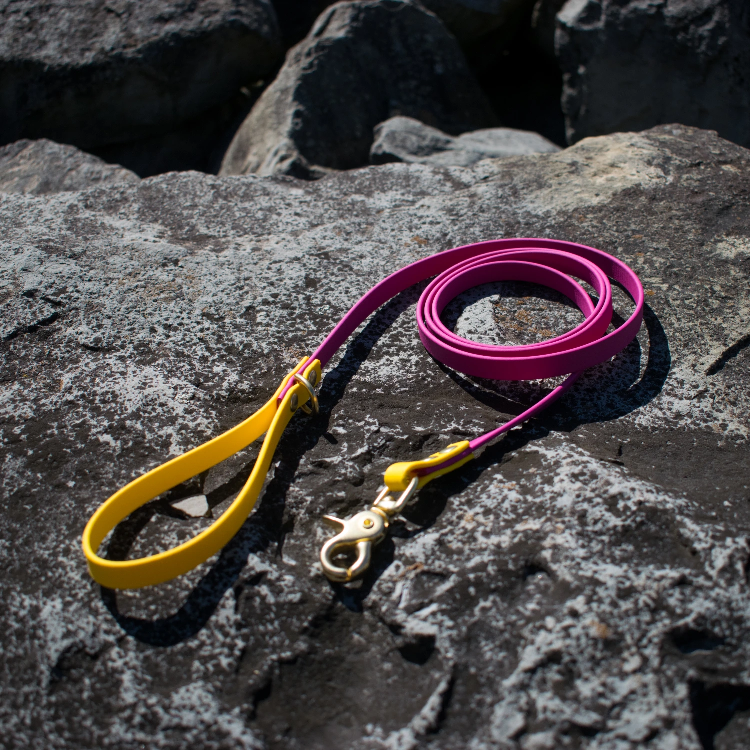 The subset vibes collection is a classic leash in some of our favorite vibrant sunset biothane colors! Choose from violet, purple, magenta, salmon, and orange biothane colors that come standard with yellow accents and gold hardware. These leashes come in 3 sizes to fit your needs! ½ inch biothane with a trigger snap and mini D-ring on the handle. Washable, stink proof, and durable, biothane is the best choice for adventure dogs!