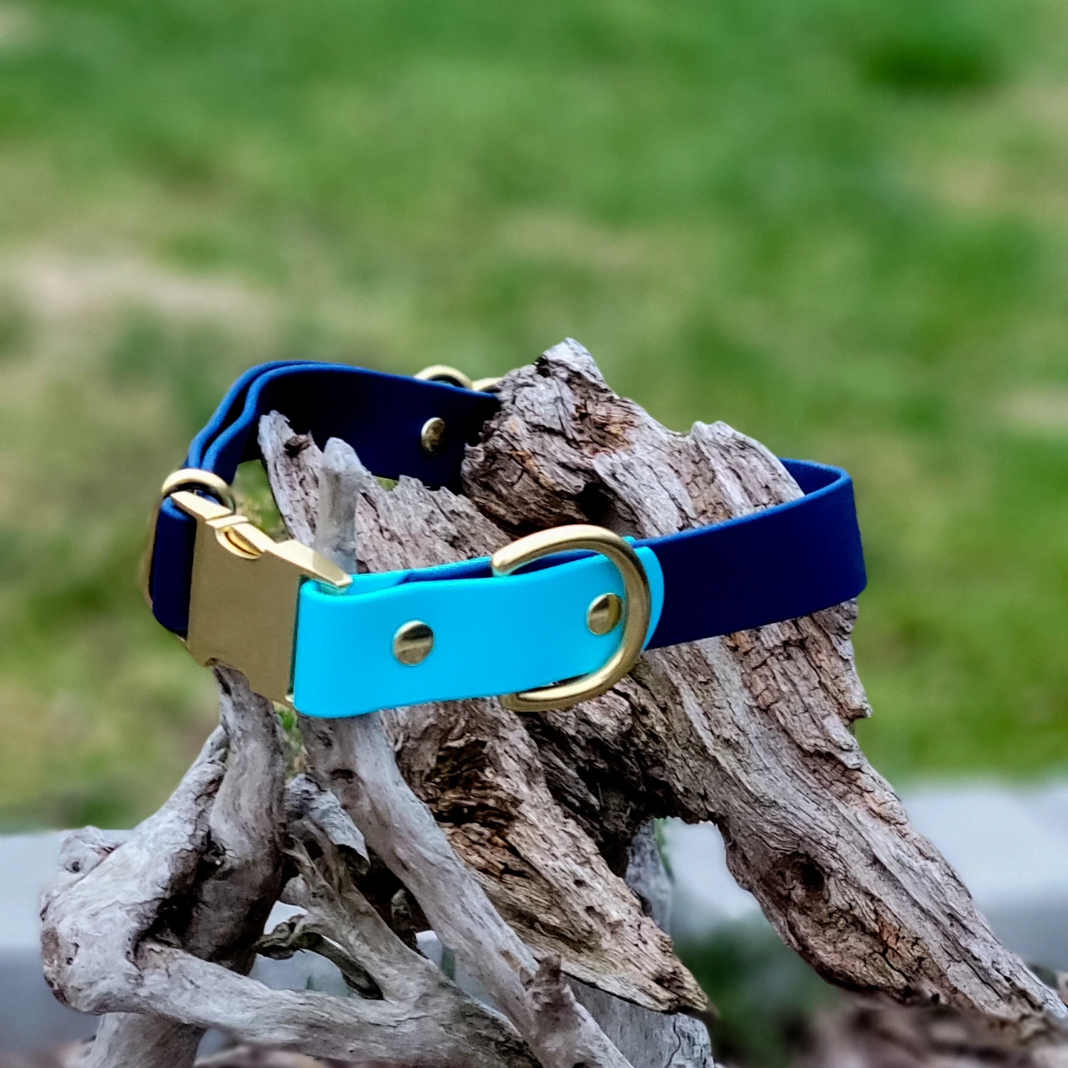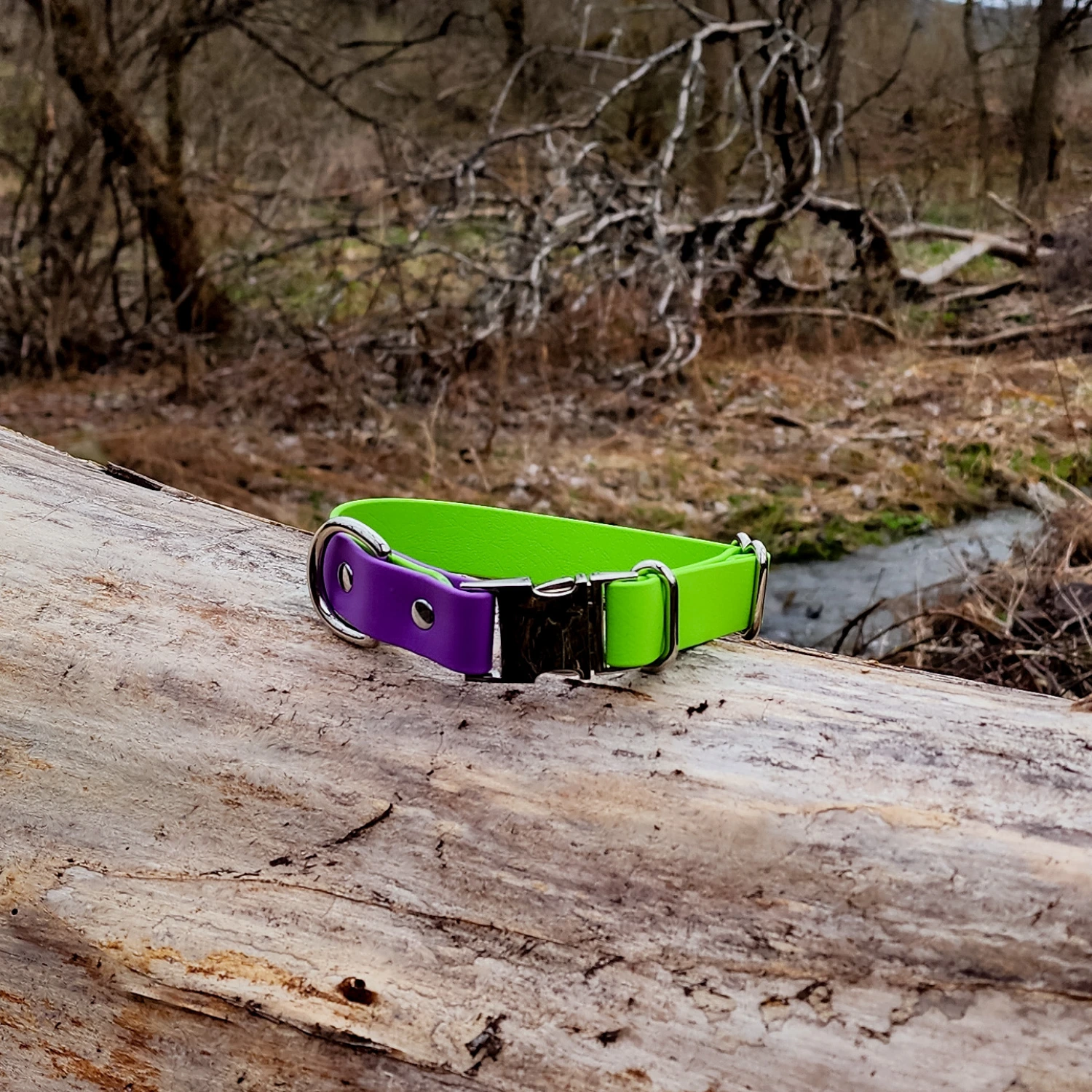 Our quick release biothane collar with an added pop of color! 1 inch biothane with a quick release buckle and D-ring for tags and leash snaps. Four gorgeous hardware colors. Endless biothane color combos. Washable, stink proof, and durable, biothane is the best choice for adventure dogs!  *if your dog requires larger than giant sizing, please select the giant size, and add the actual measured neck size of your dog in the order notes.*